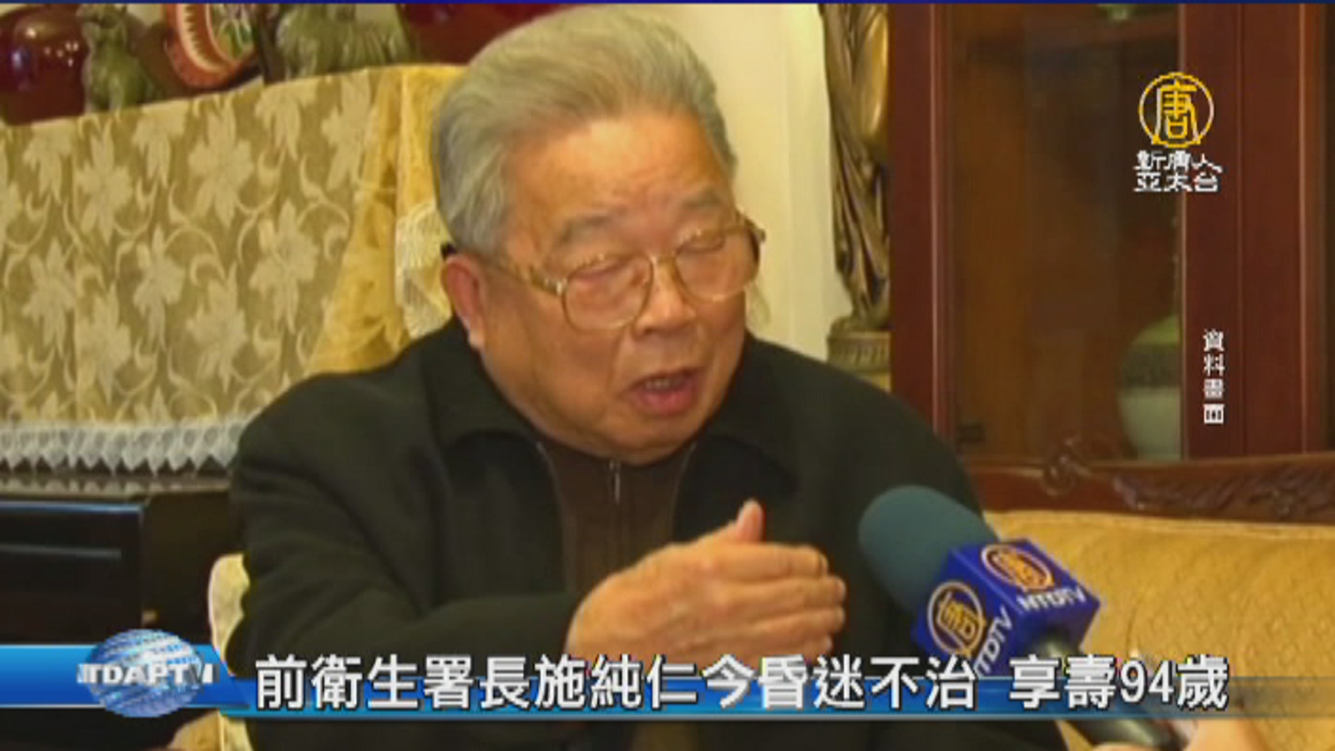 【新唐人亞太台 2017 年 06 月 18 日訊】高齡94歲的前衛生署長施純仁,今天中午12點多,因為血壓過低,被家人送至台北榮總,在救護車上失去呼吸心跳、陷入昏迷,院內醫師證實,施純仁經搶救後仍不幸辭世。施純仁是國內腦神經外科領域權威,1986年被延攬入閣,擔任衛生署長,任內完成制訂《醫療法》、建立專科醫師制度,並通過「人體器官移植條例」。他過去也多次接受新唐人採訪,譴責中共活摘器官。