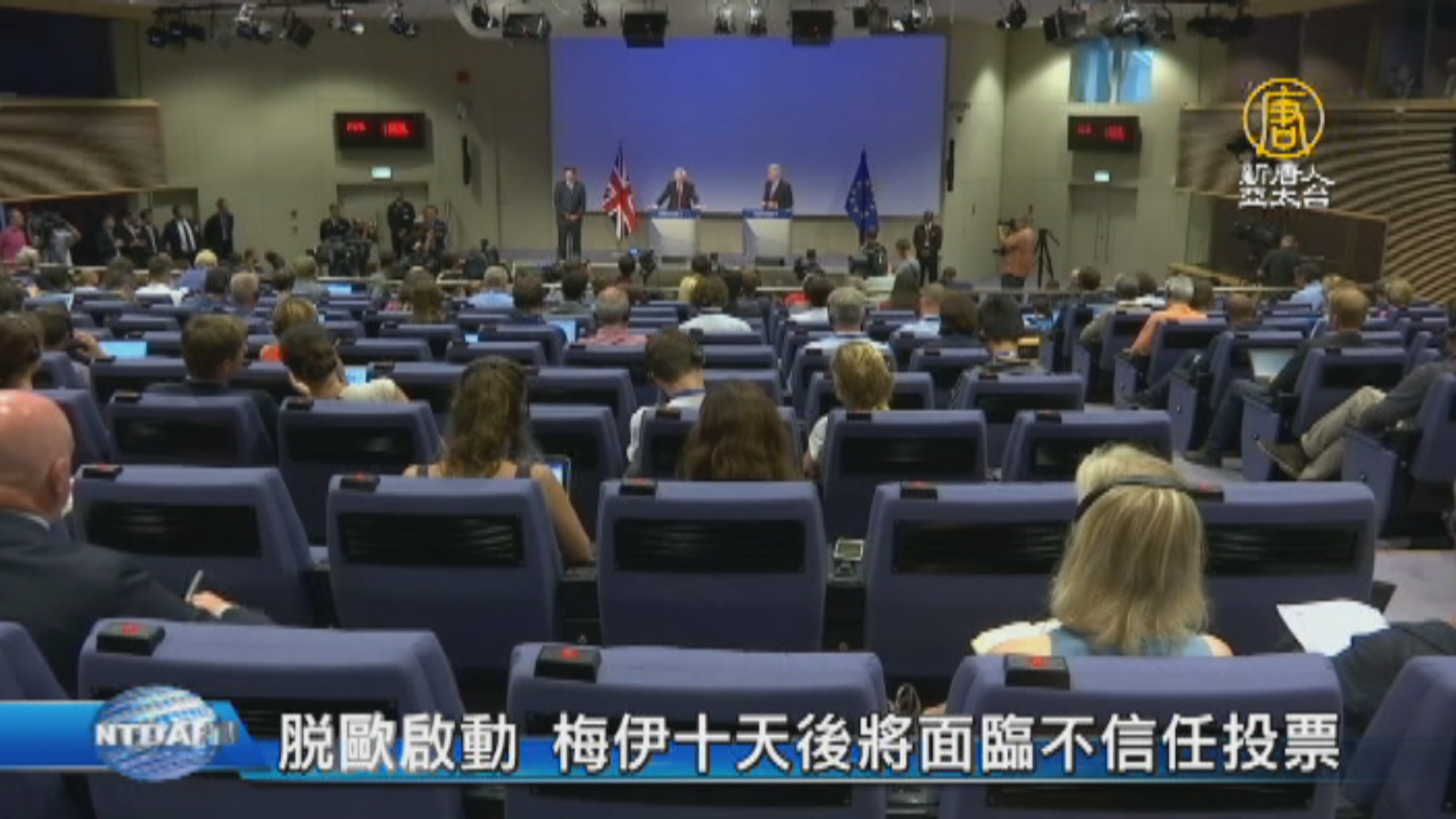 【新唐人亞太台 2017 年 06 月 20 日訊】英國和歐盟周一(19日)展開首次脫歐正式談判,雙方商定,將就英國脫歐的重大議題,再舉行每月一輪的談判,共進行四輪。國會大選失利 加上 倫敦大火處理不當 而飽受抨擊的首相梅伊,面臨強大的逼宮壓力,如果梅伊無法 重建信心,十天後,恐怕遭不信任投票。