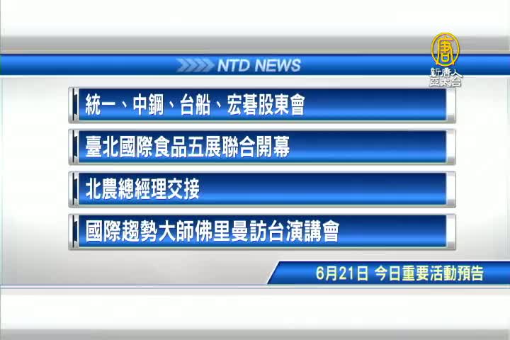 【新唐人亞太台 2017 年 06 月 21 日訊】接著看到,今天,6月21日,星期三 ,有哪些重要活動。首先是,統一、中鋼、台船、宏碁,都在今天召開股東會;臺北國際食品五展聯合開幕;再來是,北農總經理交接;以及國際趨勢大師佛里曼訪台新書發表及演講會。