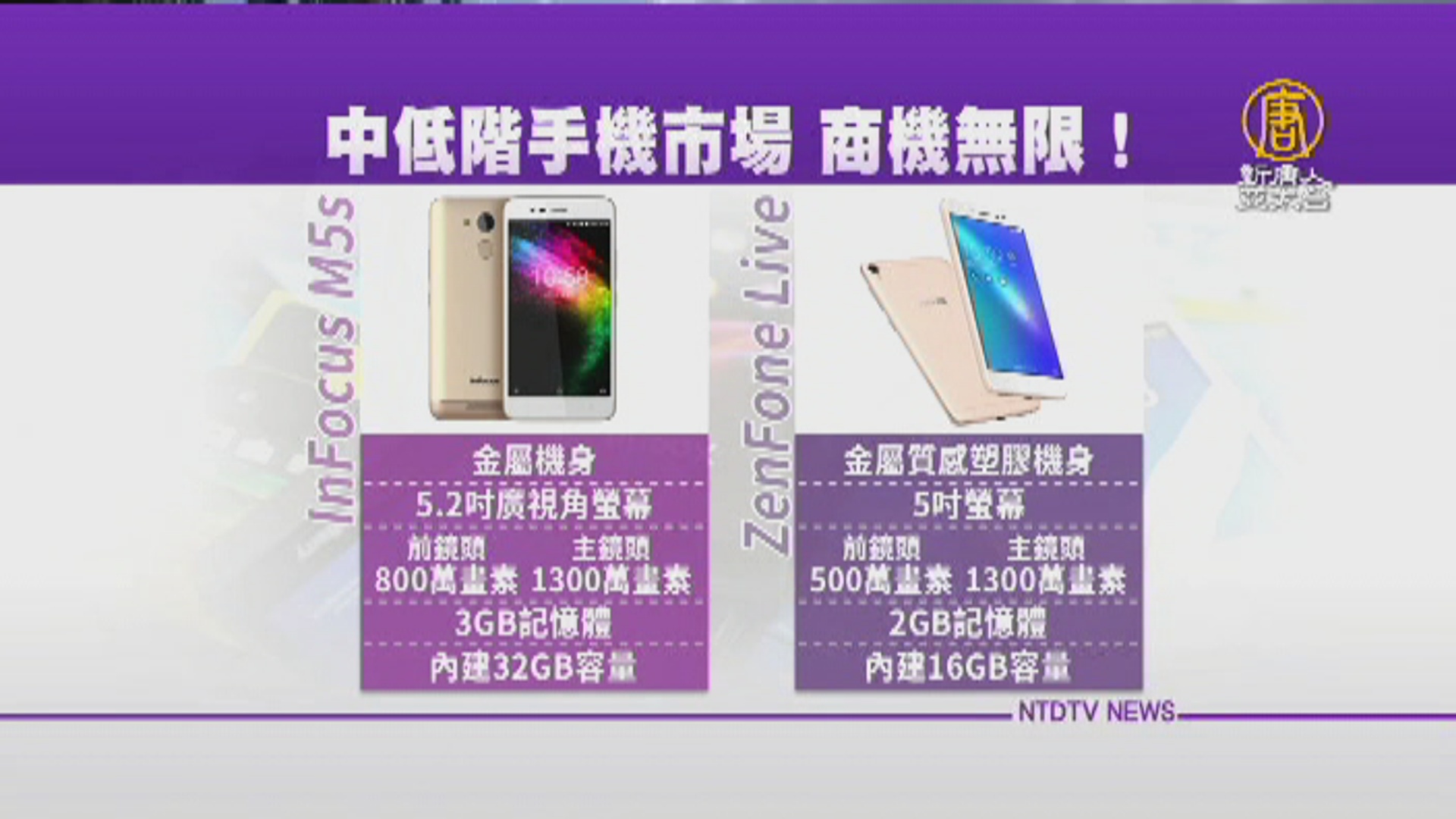 同樣主攻中低階市場的,還有採金屬機身的InFocus M5s,搭配5.2吋的廣視角螢幕,具有800萬畫素前鏡頭,以及1300萬畫素主鏡頭,並且搭載3GB記憶體,內建32GB容量;主打美顏直播技術的ZenFone Live,採金屬質感的塑膠機身,搭載5吋螢幕,前鏡頭500 畫素、主鏡頭1300萬畫素,並且搭載2GB記憶體,內建16GB容量。