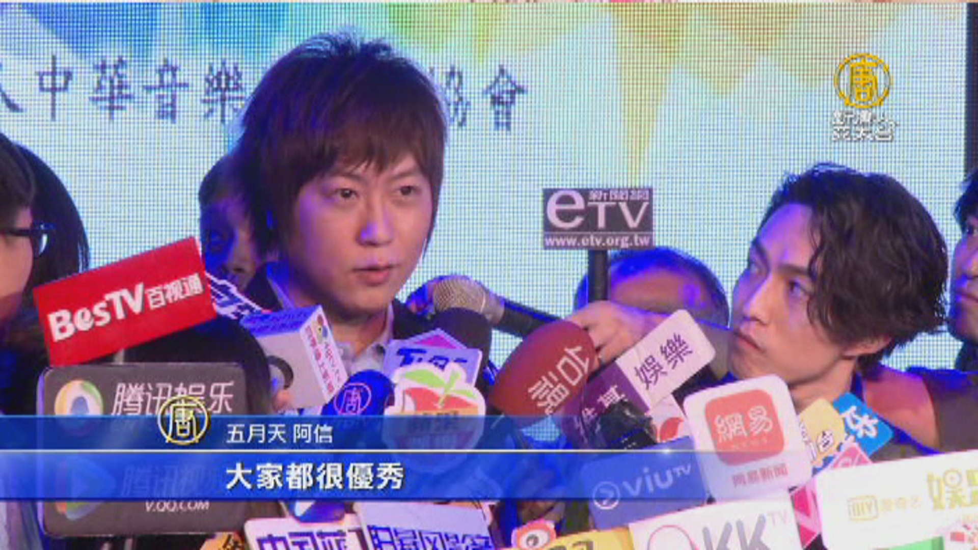 五月天 阿信 VS 記者:「沒信心。(怎麼說,你覺得誰是最大勁敵?)因為其實我覺得,大家都很優秀,大家都很傑出,然後大家也都很,就是在音樂上很用心,所以我覺得不管誰得,都是實至名歸。」