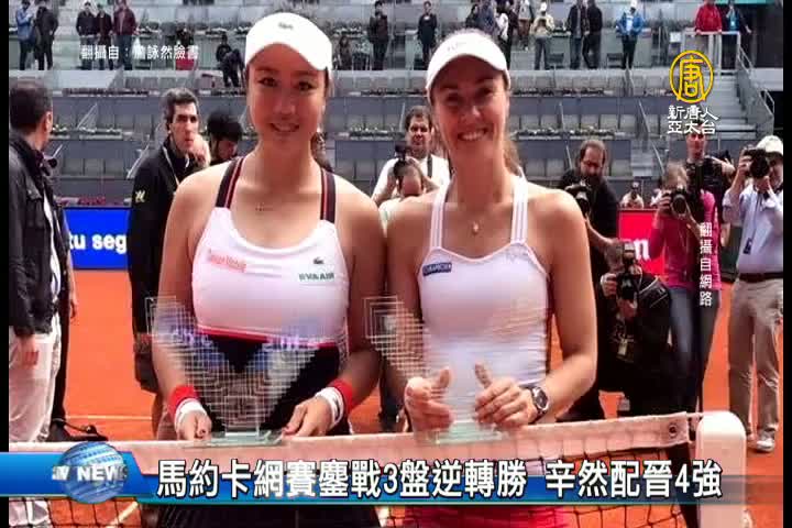 【新唐人亞太台 2017 年 06 月 23 日訊】網球女子雙打世界排名第6的台灣好手詹詠然,搭檔 世界第3的「瑞士公主」辛吉絲 ,以大會第一種子身分,在西班牙舉行的馬約卡公開賽8強賽中,遭遇比利時 梅騰絲 與 荷蘭 素爾絲 的組合,「辛然配」以2比6、6比3、10比7,連續2天,都打滿3盤,逆轉獲勝,晉級四強。