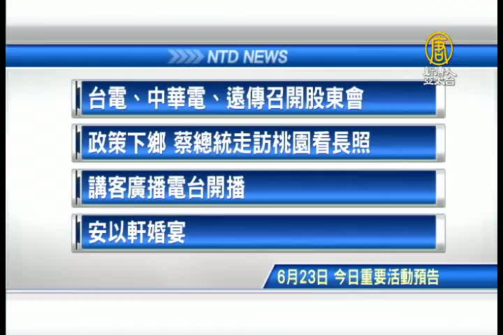 【新唐人亞太台 2017 年 06 月 23 日訊】接著看到,今天,6月23日,星期五 ,有哪些重要活動。首先是,台電、中華電、遠傳召開股東會;政策下鄉,蔡總統今天走訪桃園看長照 ;NCC核發講客廣播電台今天開播;以及,藝人安以軒婚宴。