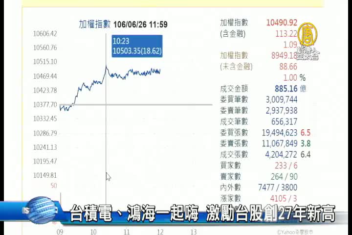 【新唐人亞太台 2017 年 06 月 26 日訊】來關心台股,台積電今天(26日)上演除息行情,開盤因而蒸發61點,不過隨著台積電盤中買盤增溫,填息超過6成,加上鴻海強漲逾5%等權值股助陣,台股盤中大漲百點,一度衝高至10503.35點,順利突破10500點,台股再創1990年5月以來新高,續飆27年新高。