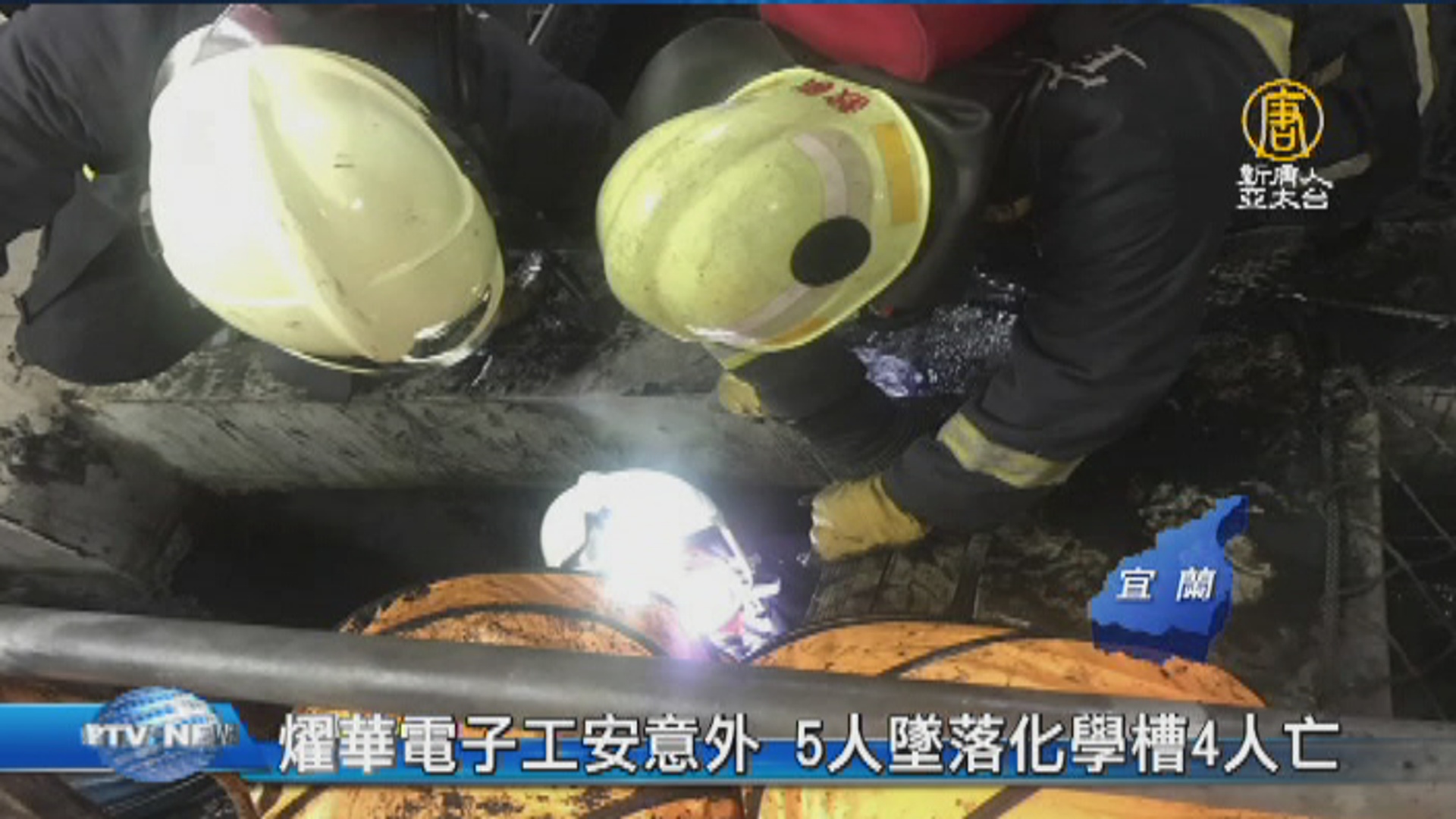 【新唐人亞太台 2017 年 06 月 26 日訊】火線新聞,帶您關心,燿華電子位在宜蘭的工廠,上午發生嚴重工安意外,2名工人在例行性清理化學槽時不慎滑倒,外面戒護人員,緊急通知救援,但連同救援的3個人,也不慎墜入池內,其中4人經送醫後搶救無效,稍早醫院,已經宣布死亡。