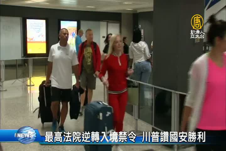 【新唐人亞太台 2017 年 06 月 27 日訊】接著看到,美國川普政府先前限制,六個穆斯林為主國家人民入境90天,美國最高法院今天裁定,推翻了下級法院封殺這項禁令的命令,允許可以部分執行。這項判決堪稱川普的逆轉勝,對此,川普形容是國家安全的勝利。而美國國土安全部表示,將以專業和公開方式執行禁令,並與旅遊業者協調合作。