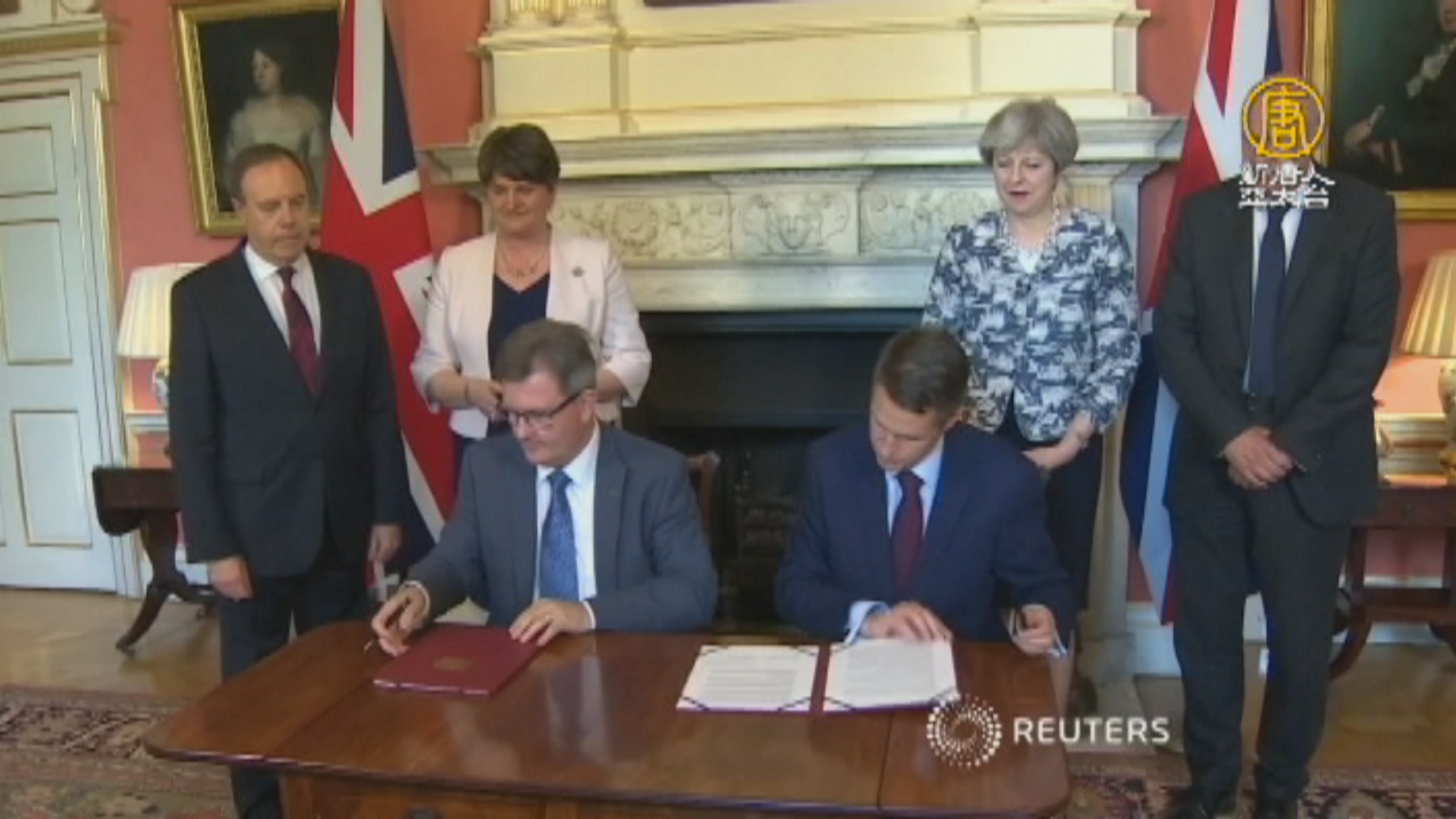 【新唐人亞太台 2017 年 06 月 27 日訊】國際重要訊息,來看到,英國經過兩個多禮拜的協商,26日,英國保守黨終於與北愛爾蘭的民主聯盟黨(DUP)達成協議,在國會擁有10席的北愛爾蘭民主聯盟黨,將支持首相梅伊成立少數政府,而代價是,英國政府將以10億英鎊,大約台幣395億元的「牽手費」,兩年內提撥額外支出給北愛爾蘭的學校、醫療和基礎設施,以確保英國保守黨可以順利執政。