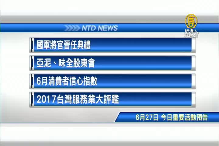 【新唐人亞太台 2017 年 06 月 27 日訊】接著看到,今天,6月27日,星期二 ,有哪些重要活動。首先是,總統蔡英文,出席國軍將官晉任典禮;亞泥、味全股東會;6月消費者信心指數公布;以及2017台灣服務業大評鑑。