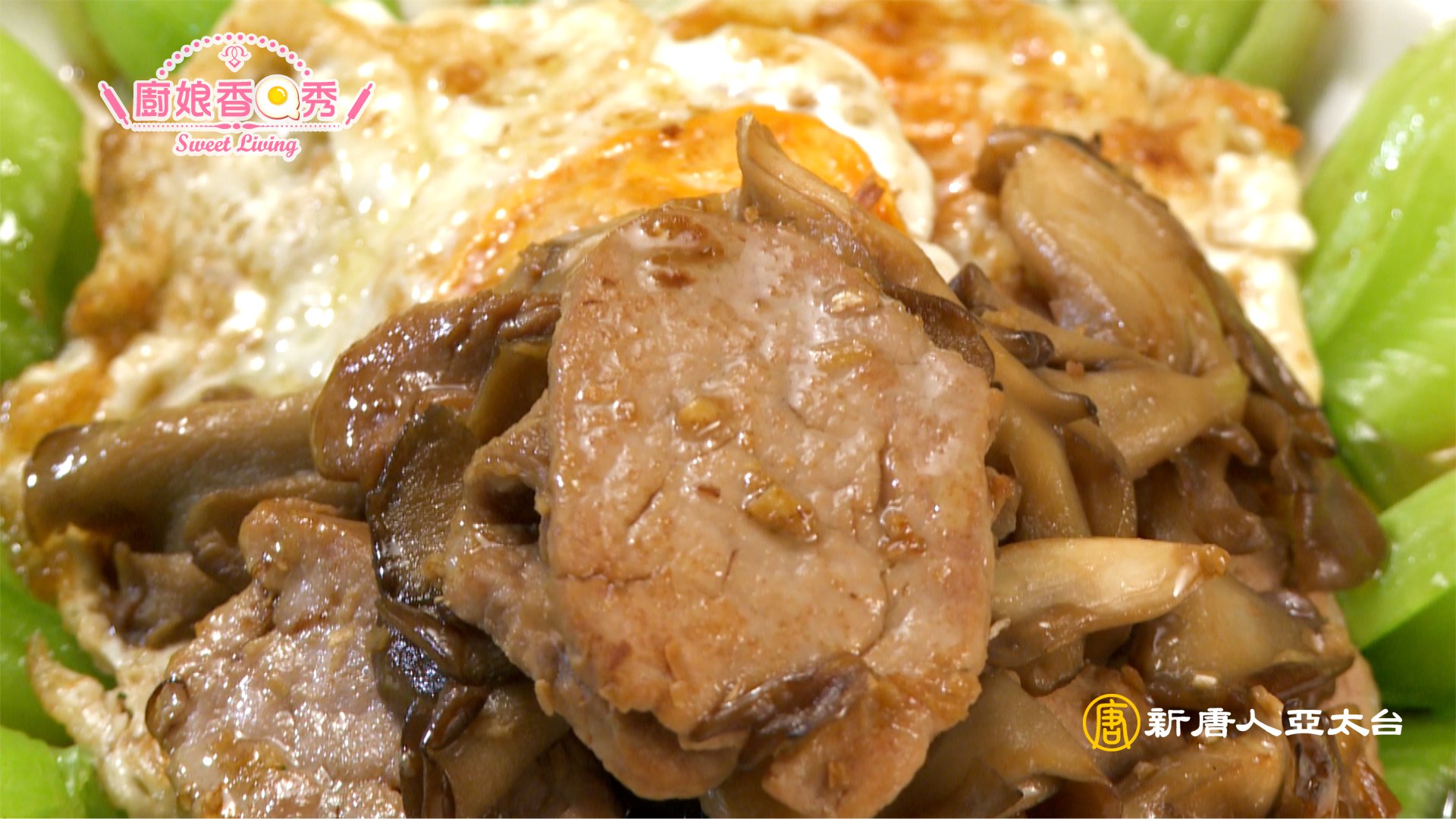 舞菇腰內肉食材:腰內肉150公克、蛋3粒、薑末30公克、青江菜100公克、舞菇50公克、蔥花30公克
