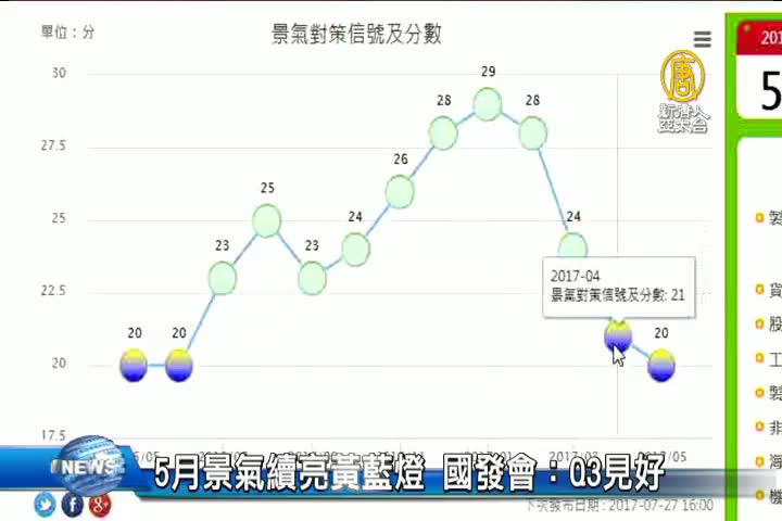 【新唐人亞太台 2017 年 06 月 27 日訊】再來看到。國發會今天公布5月景氣燈號,持續亮出代表「趨弱」的黃藍燈,而綜合判斷分數,則比較上個月減少1分,降至20分,主因是製造業銷售量指數,受比較基期的影響,導致年增率下滑,但景氣仍持續平穩,第三季可望看到好轉。