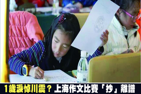 日前,上海有40多篇參賽的小學生作文被發現屬於抄襲,其中有四年級學生描寫2008年參與汶川地震哀悼時,自己悲痛至「淚流滿面」,而該學生當年只有1歲。