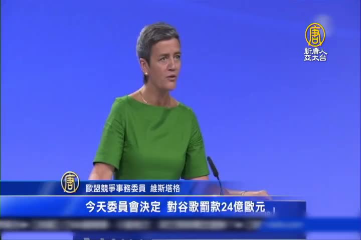 【新唐人亞太台 2017 年 06 月 28 日訊】再來看到,歐盟反壟斷監管機構祭出天價罰金,指責美國搜尋引擎巨擘Google,違反反壟斷法,開罰24億歐元,相當於832億天價台幣,還限期Google90天內改善,否則還將面臨更多罰款。