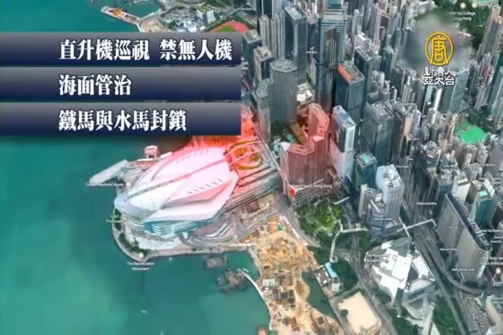 在習近平入住的君悅酒店,和特首就職典禮的會展中心一帶,海陸空全面戒備:港府直升機空中巡視、禁飛無人機;海面實施管制;街上部署鐵馬與水馬封鎖,防止撞車襲擊,警方沿街排查可疑物,防止擱置炸彈。