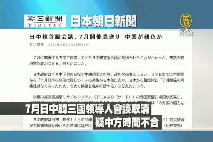 【新唐人亞太台 2017 年 06 月 29 日訊】來看到日本朝日新聞報導:7月日中韓三國領導人會談取消,似乎是中國方面時間不合。