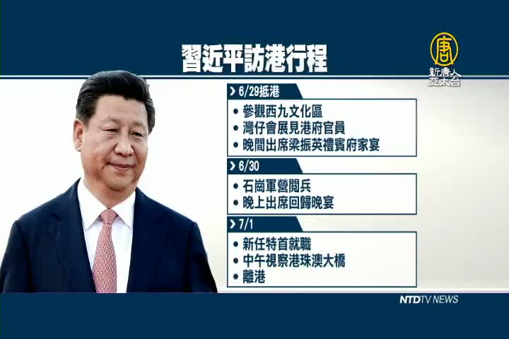 【新唐人亞太台 2017 年 06 月 29 日訊】好,中國國家主席習近平今天(29日)開始,訪問香港3天。中午搭機抵達香港機場,向媒體發表談話之後,接著第一個行程,將參觀西九文化區,隨後到灣仔會展,與港府官員見面,晚間出席即將卸任的香港特首梁振英在禮賓府的家宴。週五早上將前往石崗軍營閱兵,晚上出席回歸晚宴,7月1日當天,出席新任特首就職典禮,中午視察港珠澳大橋,之後就會離開香港。