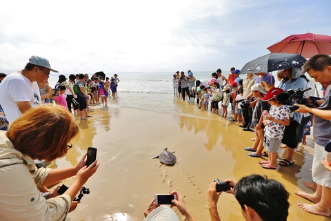 在大家祝福聲中,綠蠵龜一步步的向大海前行。(金門縣政府建設處提供)