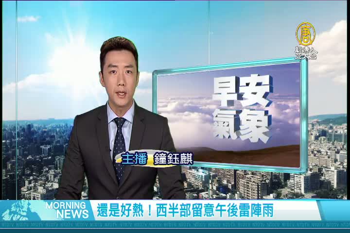 【新唐人亞太台 2017 年 06 月 30 日訊】歡迎您收看6月30日的早安新唐人,我是鐘鈺麒。先來帶您關心今天的天氣情況。今天各地天氣晴朗,水氣較多,午後雷陣雨範圍擴大,不只山區降雨機率高,西半部平地也有機會出現午後雷陣雨。各地高溫落在32到35度之間,紫外線指數偏高,提醒民眾外出注意防曬,別忘記要多補充水份以防中暑。帶您一起來看到國際媒體重要訊息。