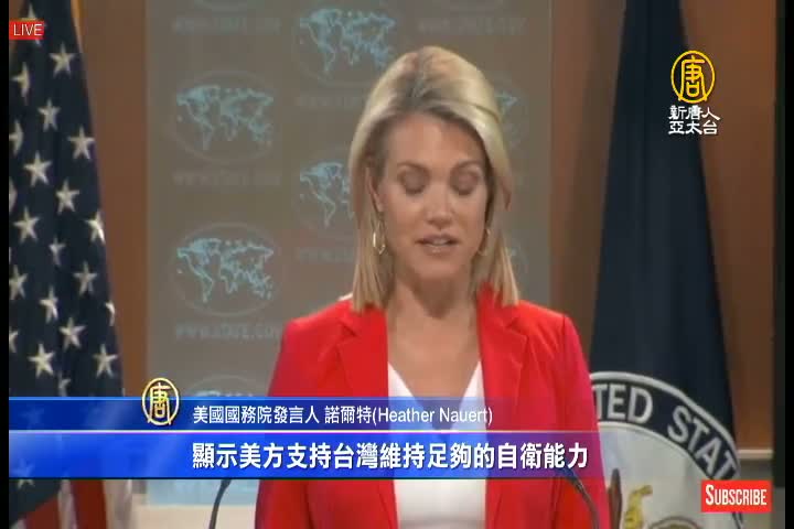 美國國務院發言人 諾爾特(Heather Nauert):「今天川普政府已經正式通知國會7項對台軍售,金額約14.2億美元,軍售通知符合台灣關係法,顯示美方支持台灣維持足夠的自衛能力。此舉不會改變美國長期以來的一中政策。」