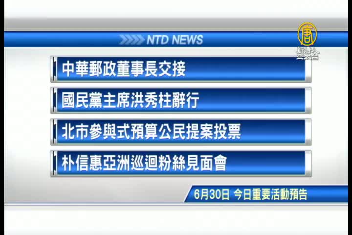 【新唐人亞太台 2017 年 06 月 30 日訊】接著看到,今天,6月30日,星期五 ,有哪些重要活動。首先是,中華郵政董事長交接;國民黨主席洪秀柱,向黨部同仁辭行;北市參與式預算公民提案投票起跑;以及韓星朴信惠亞洲巡迴粉絲見面會。