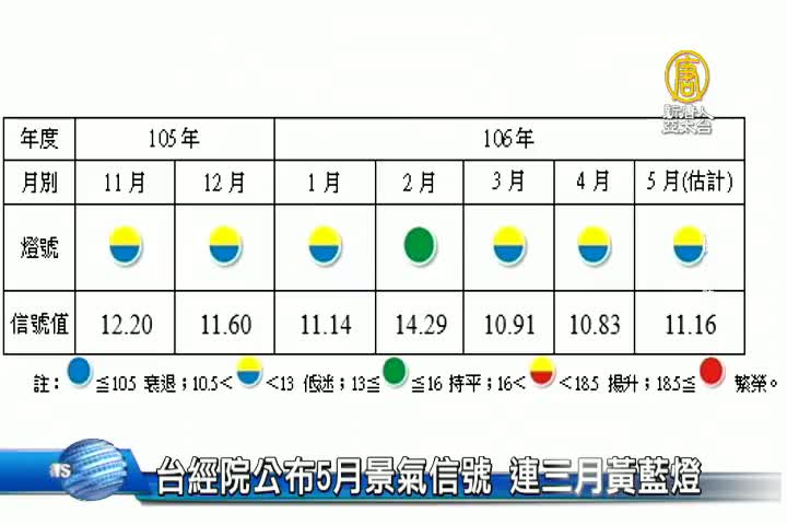 【新唐人亞太台 2017 年 06 月 30 日訊】國內景氣動向,市場關注,台經院今天公布「5月整體製造業景氣概況」,整體製造業景氣信號分數,雖較4月上升0.33分,5月來到了11.16分,但景氣燈號連續三個月呈現在低迷的黃藍燈。台經院提醒,國際油價、新台幣匯率,以及蘋果新機上市進度將是影響下半年製造業景氣關鍵。