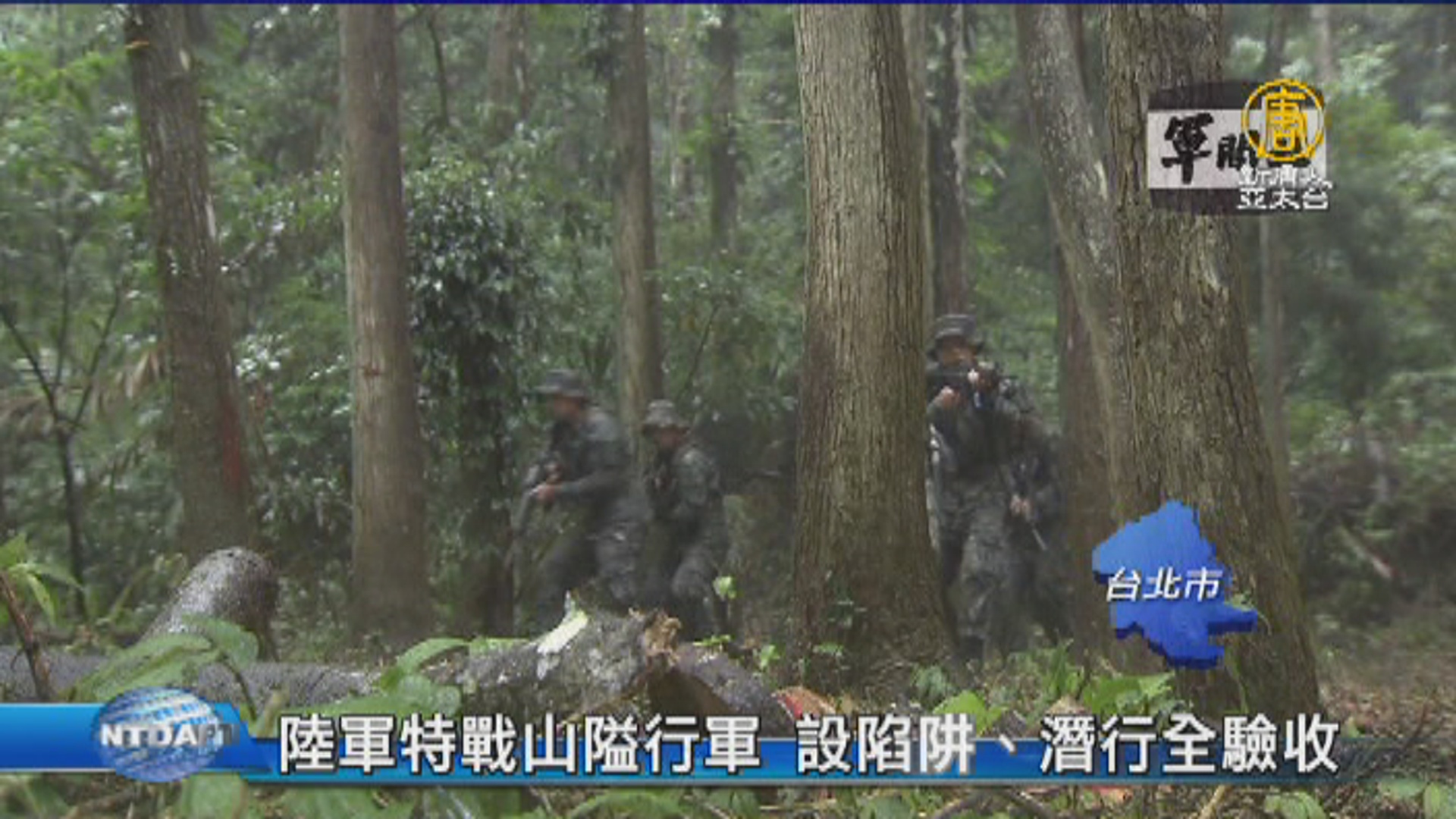 【新唐人亞太台 2017 年 07 月 01 日訊】陸軍特戰部隊,輪番進行山隘行軍訓練,官兵們得在海拔2000公尺的原始山林地,靠簡單裝備,從台中徒步向桃園前進。一路上要模擬,遭到敵軍追擊的時候,如何設置陷阱阻斷通路,還要克服濕熱的雨後叢林環境。