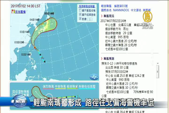 【新唐人亞太台 2017 年 07 月 02 日訊】新聞首先來看到,今天上午(2日)8點,輕颱南瑪都形成,預計今天晚上到明天上午最接近台灣。依中央氣象局預測路徑,南瑪都是以擦邊球方式經過台灣東部海域並北轉往琉球方向移動,目前看來,發布海上警報機率不高,但宜蘭花東地區仍要注意長浪,海上會有8至9級強陣風,提醒民眾,到東部海域活動要特別注意。