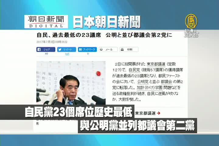 【新唐人亞太台 2017 年 07 月 03 日訊】來看到日本朝日新聞報導:日本自民黨23個席位歷史最低,與公明黨並列都議會第二黨。