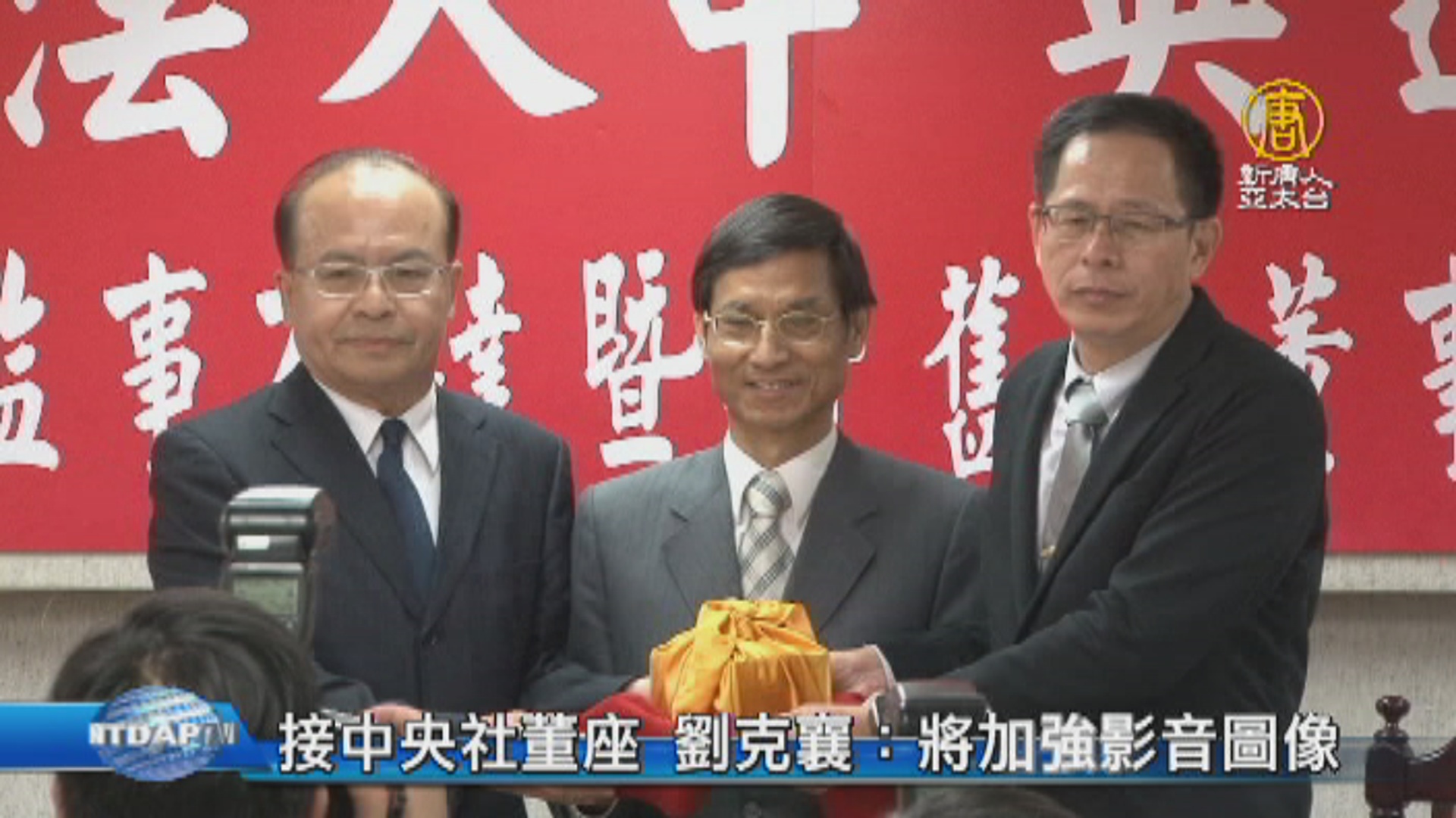 中央社上午舉行第8屆董事長交接典禮,由行政院政務委員林萬億擔任監交人,卸任董事長陳國祥交接印信,給新任董事長劉克襄。