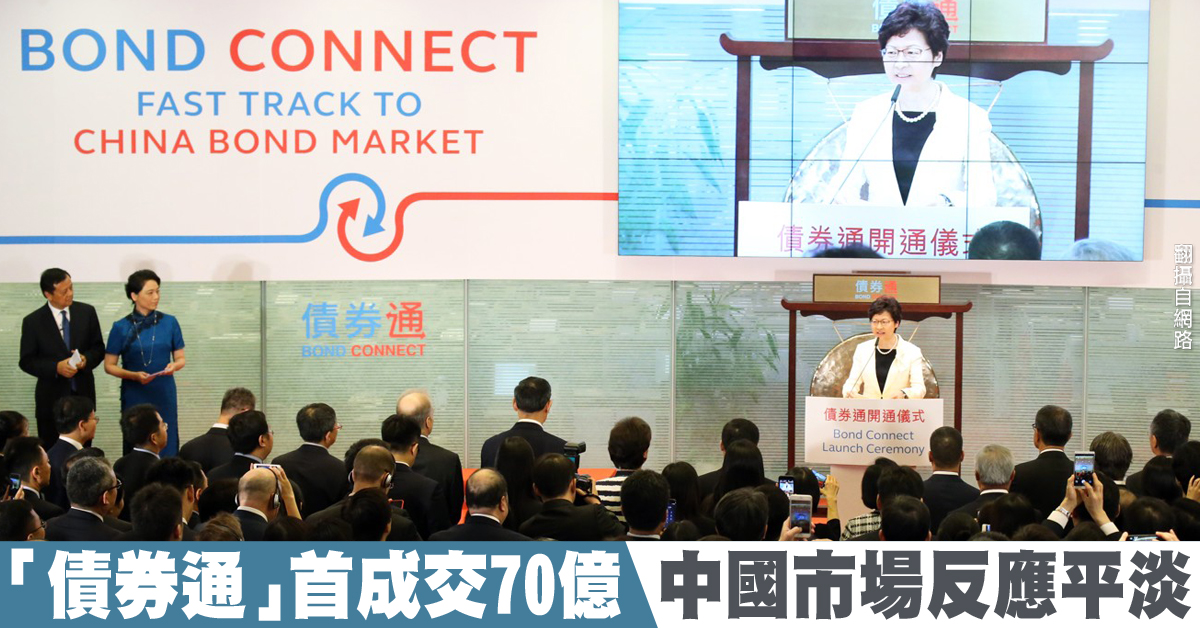 「債券通」首日開通,共有19家報價機構、70家境外機構達成142筆成交,當中買入交易佔128宗,涉及金額49.04億元,涵蓋各類型債券。
