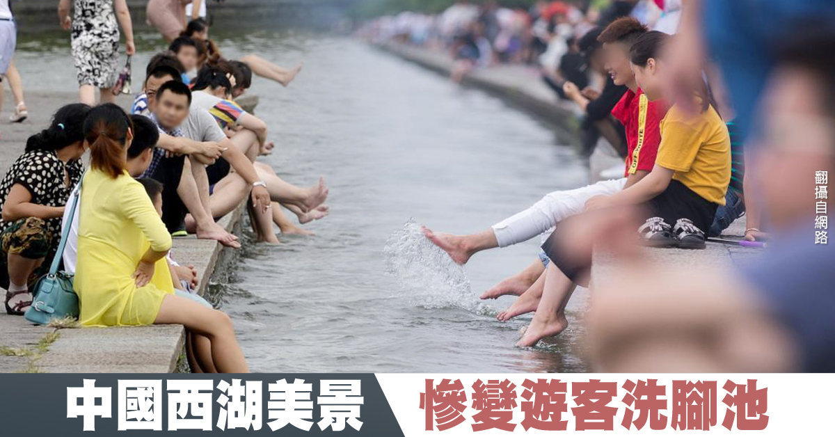 中國杭州西湖自古以美景出名,但最近在西湖白堤上,卻有大批遊客紛紛脫下鞋襪,將裸足泡進湖水裡,讓西湖慘變成洗腳池。據《新浪網》報導,在7月1日週末的時候,遊客們蜂擁至西湖,當場洗腳、泡腳或戲水,為了消暑,引發中國網友熱議,非常不文明。