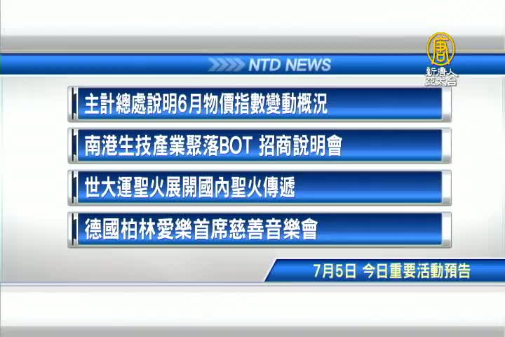 【新唐人亞太台 2017 年 07 月 05 日訊】接著看到,今天,7月5日,星期三 ,有哪些重要活動。首先是,主計總處說明6月物價指數變動概況;再來是,南港生技產業聚落BOT 招商說明會;世大運聖火展開國內聖火傳遞;以及,德國柏林愛樂首席慈善音樂會今晚在彰化演出。