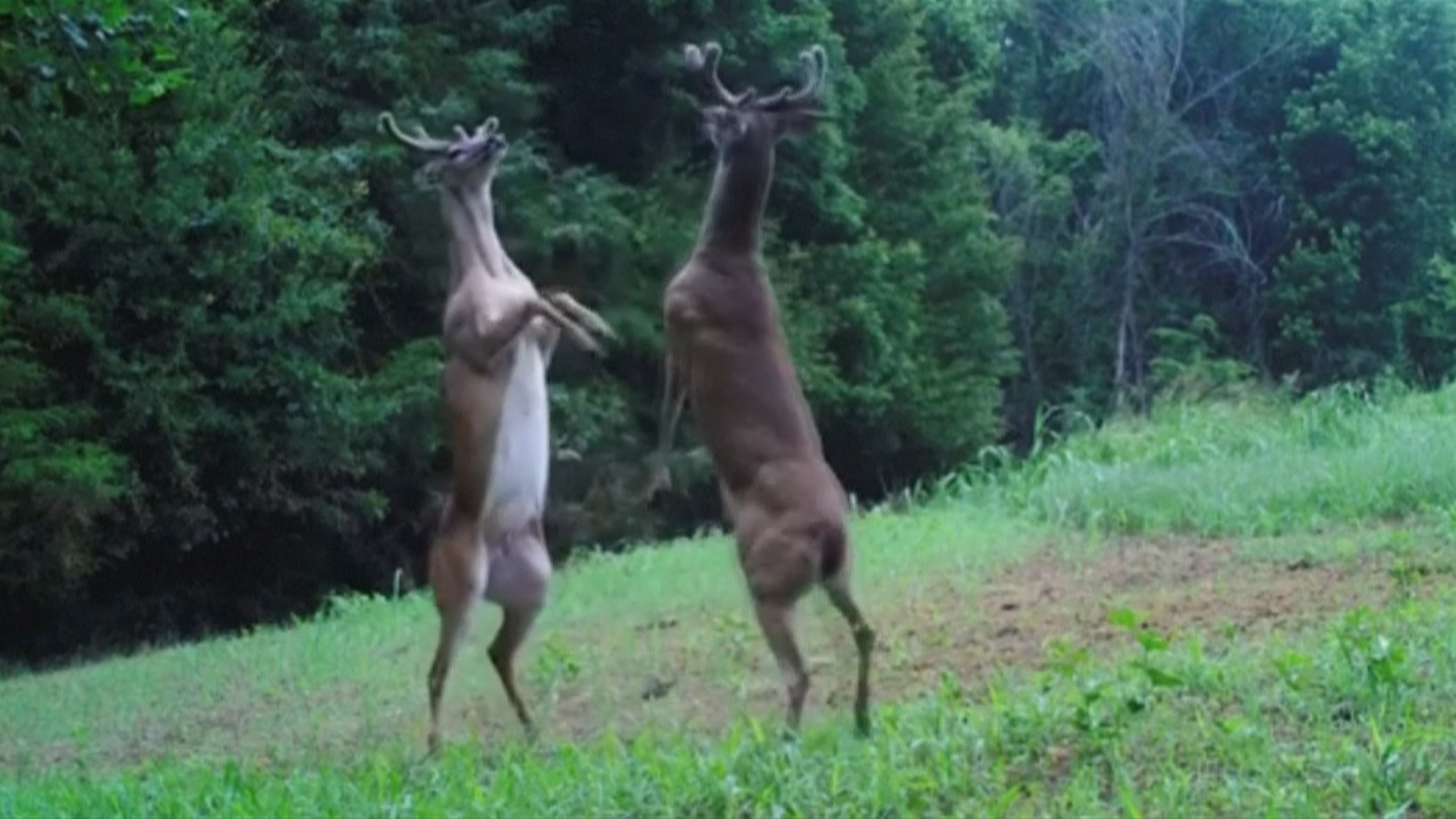 (6月21日)在美國南方的田納西州(State of Tennessee),有兩隻野鹿靠後腿站立的姿勢,用前腿打架,而且畫面中可以看到,野鹿的後腿還可以像袋鼠一樣蹦跳,來靠近對方,相當罕見,看似激烈又好笑。