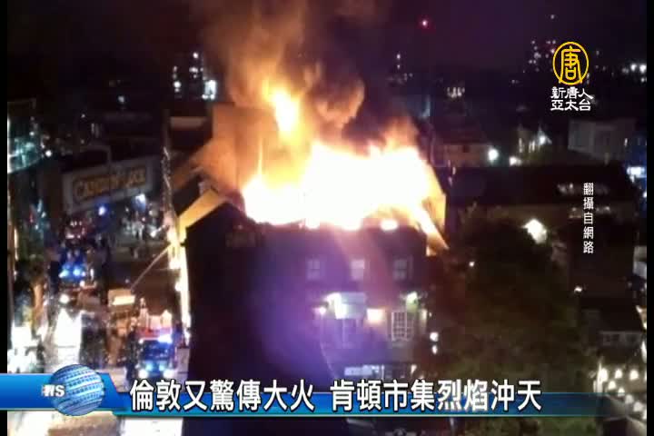 【新唐人亞太台 2017 年 07 月 10 日訊】新聞首先來看到,英國倫敦又慘遭祝融之禍,繼上個月才發生至少80人喪命的格蘭菲塔大火後,英國倫敦北部的著名旅遊景點肯頓市集,今天又在當地凌晨傳出火災,當局立刻派出10輛消防車及超過70名消防員前往現場撲救,倫敦消防局表示,市集內一棟三層樓高的建築物已經遭大火吞噬,不過幸好發生的時間是深夜,市集內沒有商家營業,目前火勢已獲控制,暫未有傷亡消息傳出。但現場火勢蔓延迅速,有目擊者擔心市集內有餐廳及廚房,擔心建築物可能隨時會爆炸。