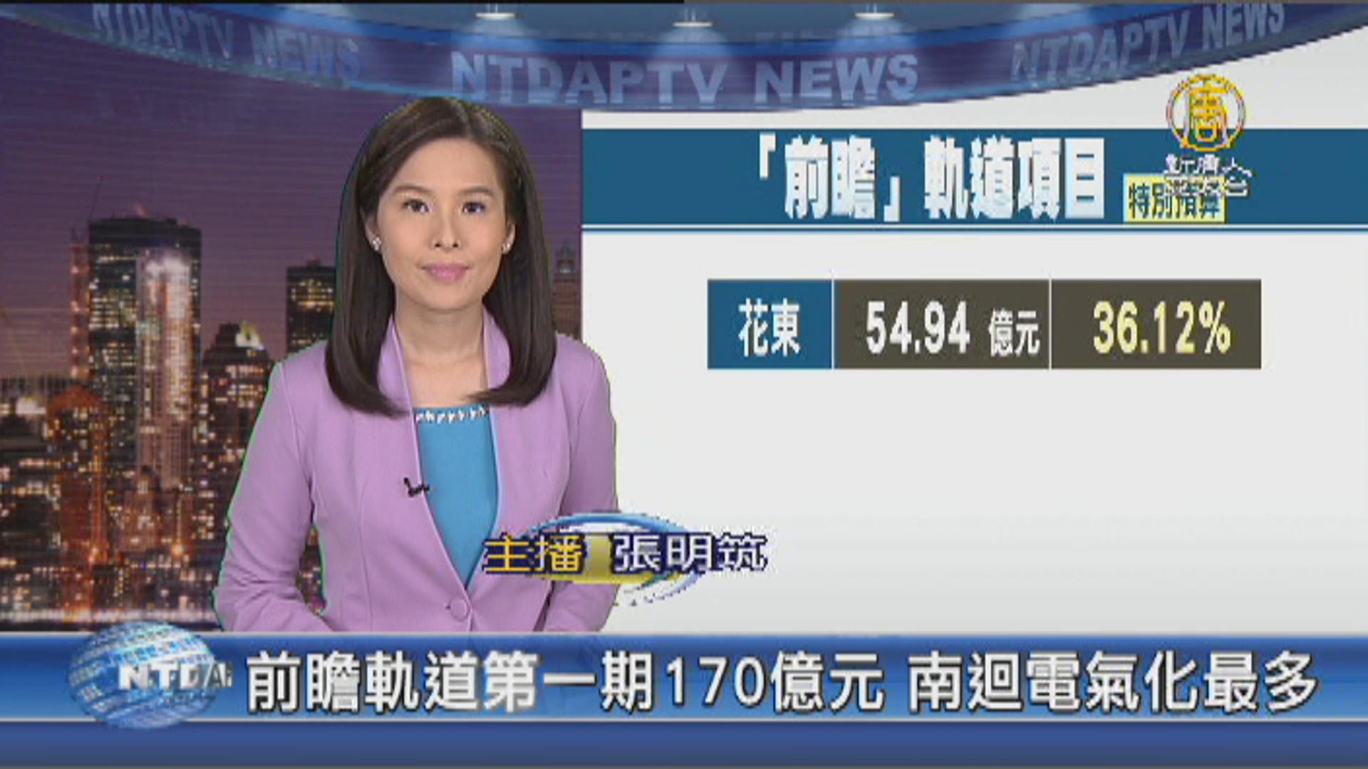 【新唐人亞太台 2017 年 07 月 10 日訊】新聞一開始,先帶您關心,前瞻基礎建設第一期特別預算,預計在明天,星期二,要來經「臨時行政院會」 通過。好,根據行政院,今天公布「前瞻」軌道項目的首期特別預算,共計170.69億元,其中花東獲得54.94億元,佔36.12%最多,其次是台南市獲29.95億元,佔19.69%;第三則為新北市為21.4億元,佔14.07%。另外,軌道建設共編列37項計畫、170.69億元。其中有18.59億元,用於台鐵電務智慧化、票務系統整合,以及軌道技術研究暨驗證中心,其餘152.1億元,則用於各縣市的34項軌道建設。而軌道建設中最大筆的預算,是花東的「台鐵南迴台東潮州段電氣化計畫」。