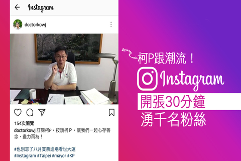 台北市長柯文哲跟上潮流,15日首度啟用社群媒體Instagram!上線不到五小時,粉絲人數衝破四千多人,柯p說,這是適應潮流。