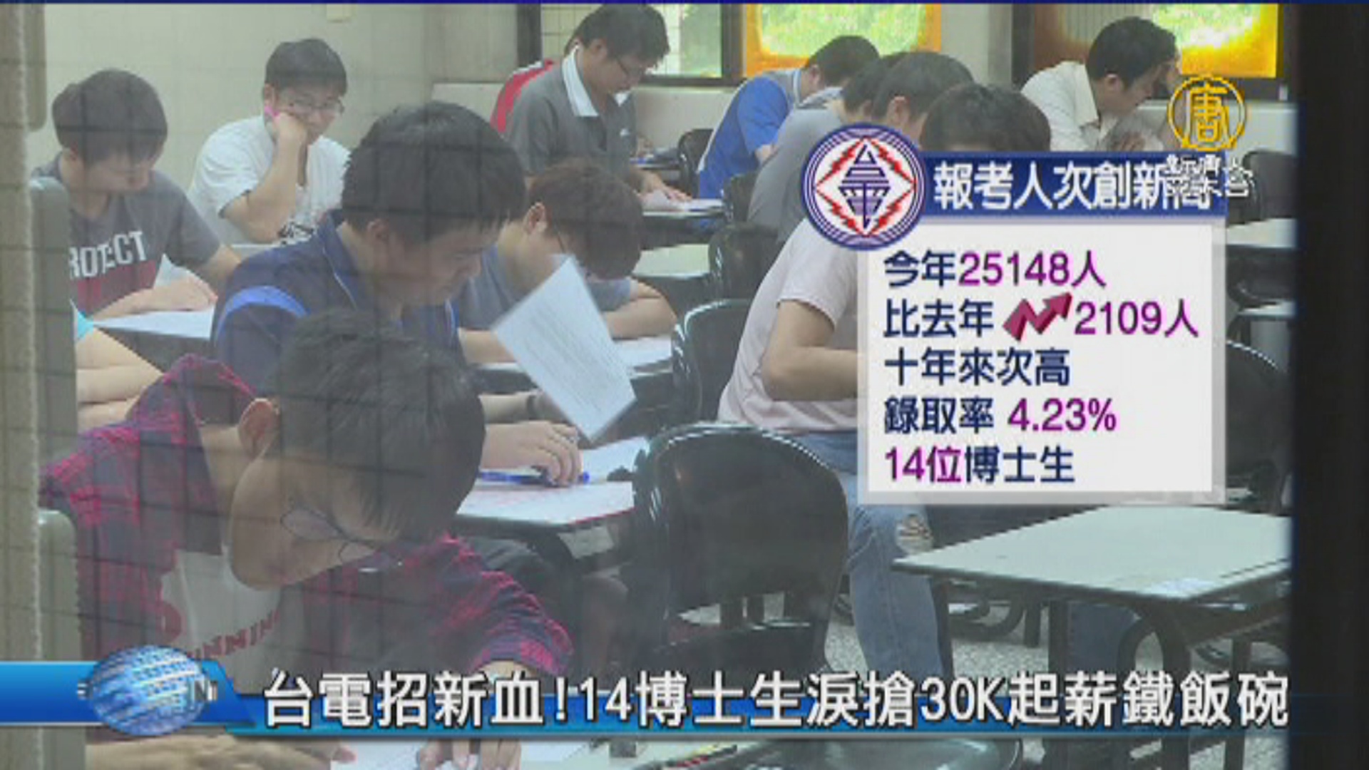 台電舉辦年度招考,吸引25148人報名,比去年(2016年)多了2千人,創下10年來次高,錄取率只有4.23%,雖然只要高中畢業就能報考,但還是有14位博士生,頂著高學歷,要來搶月薪3萬元的職缺。