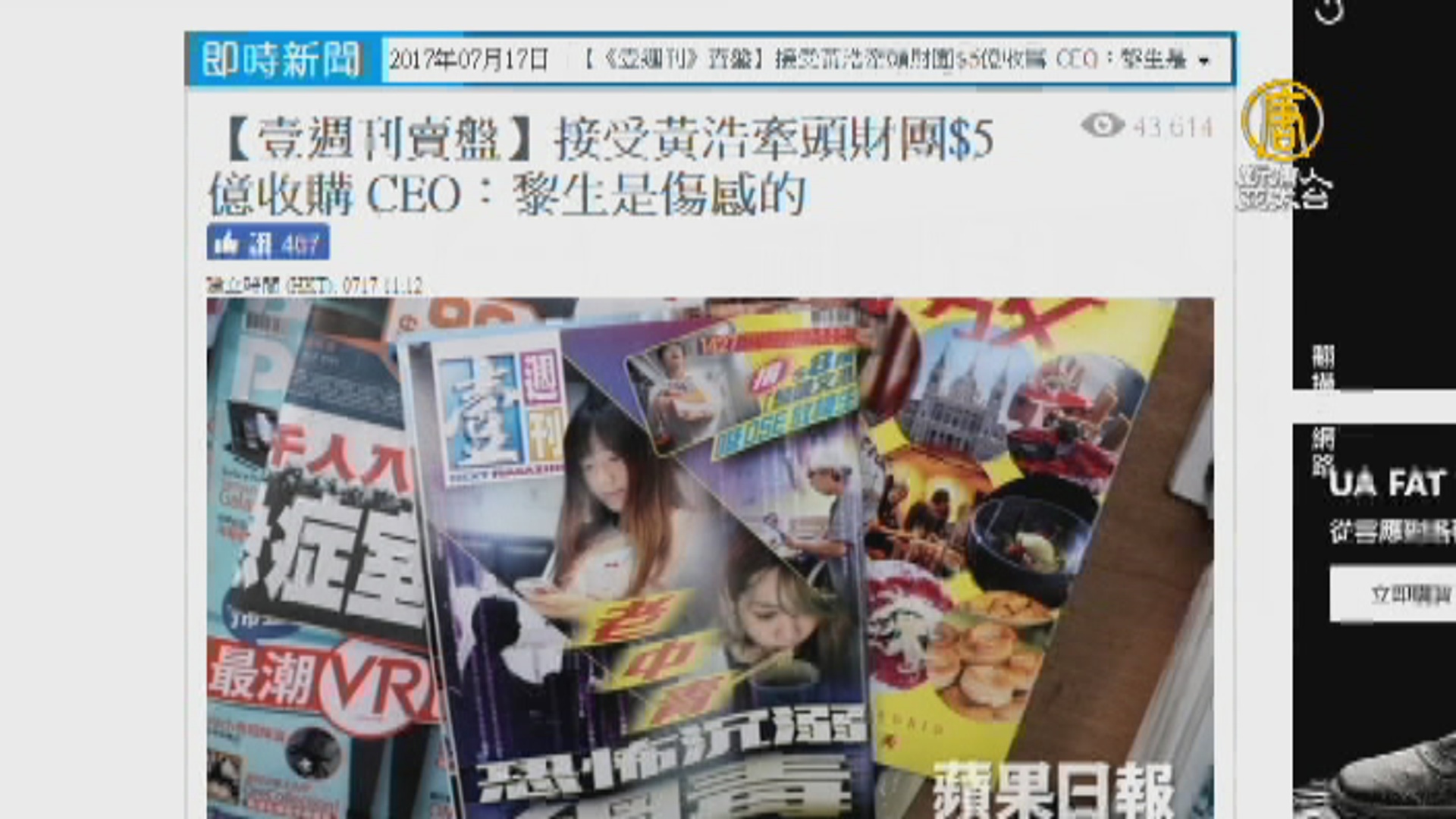 【新唐人亞太台 2017 年 07 月 17 日訊】香港壹傳媒面臨重大交易!壹傳媒上周五股價出現異動,今天早上在港股9時30分開盤前宣布停牌,停牌前股 價報0.37元。並在11點召開《壹週刊》員工大會,由壹傳媒行政總裁張嘉聲宣布,接受W brothers investment公司以5億港元收購,相當於新台幣19.7億元,9月完成交易,包括香港及台灣《壹週刊》、已經停刊的《忽然一週》、《FACE》 等,買家是香港商人黃浩。壹傳媒也發出內部「事業單位異動通告」,指出董事會已通過交易案,且買方承諾會繼續投資。