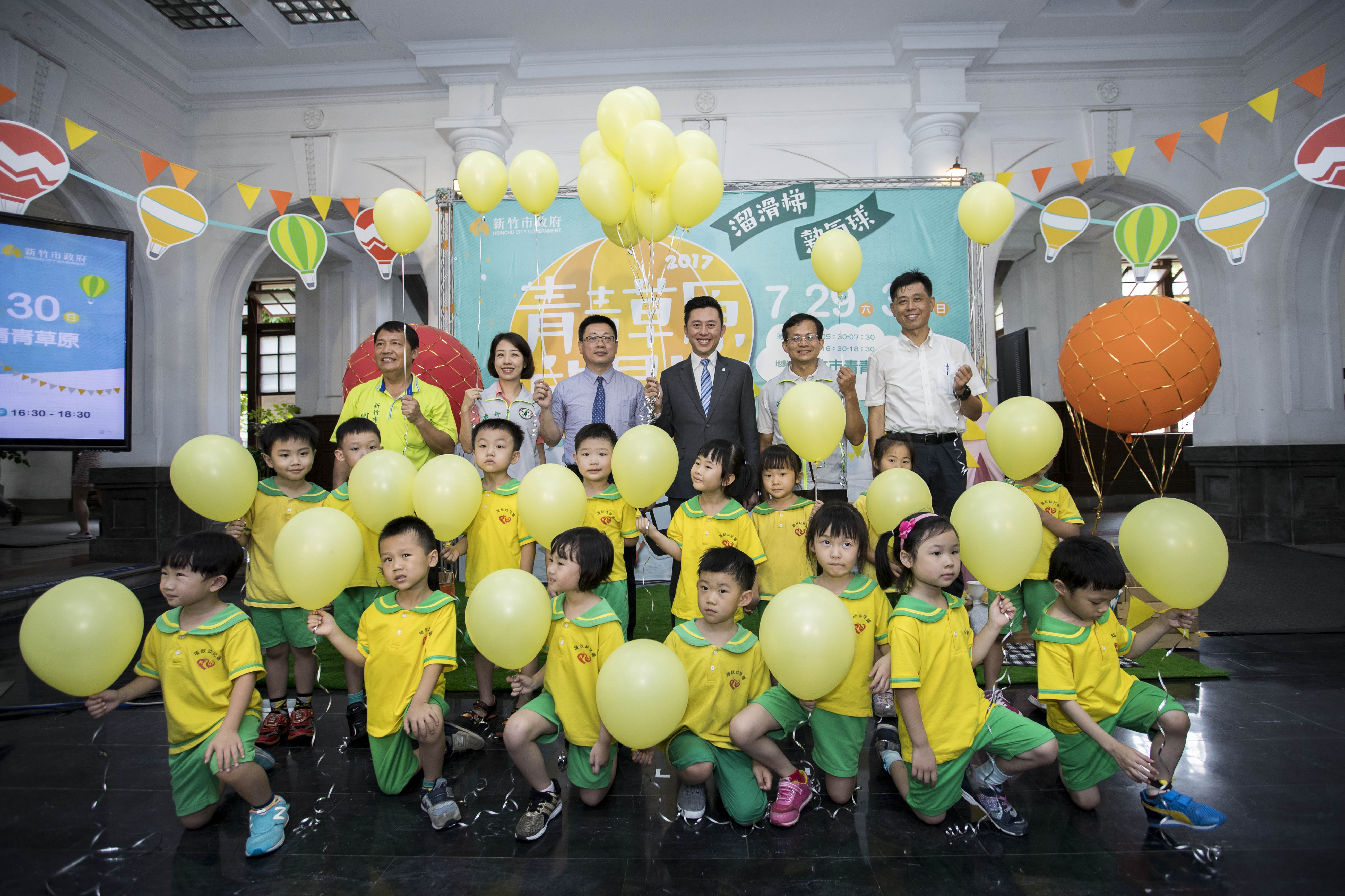 新竹市長林智堅(後排右三),邀請民眾來新竹搭乘熱氣球。(圖/新竹市政府提供)
