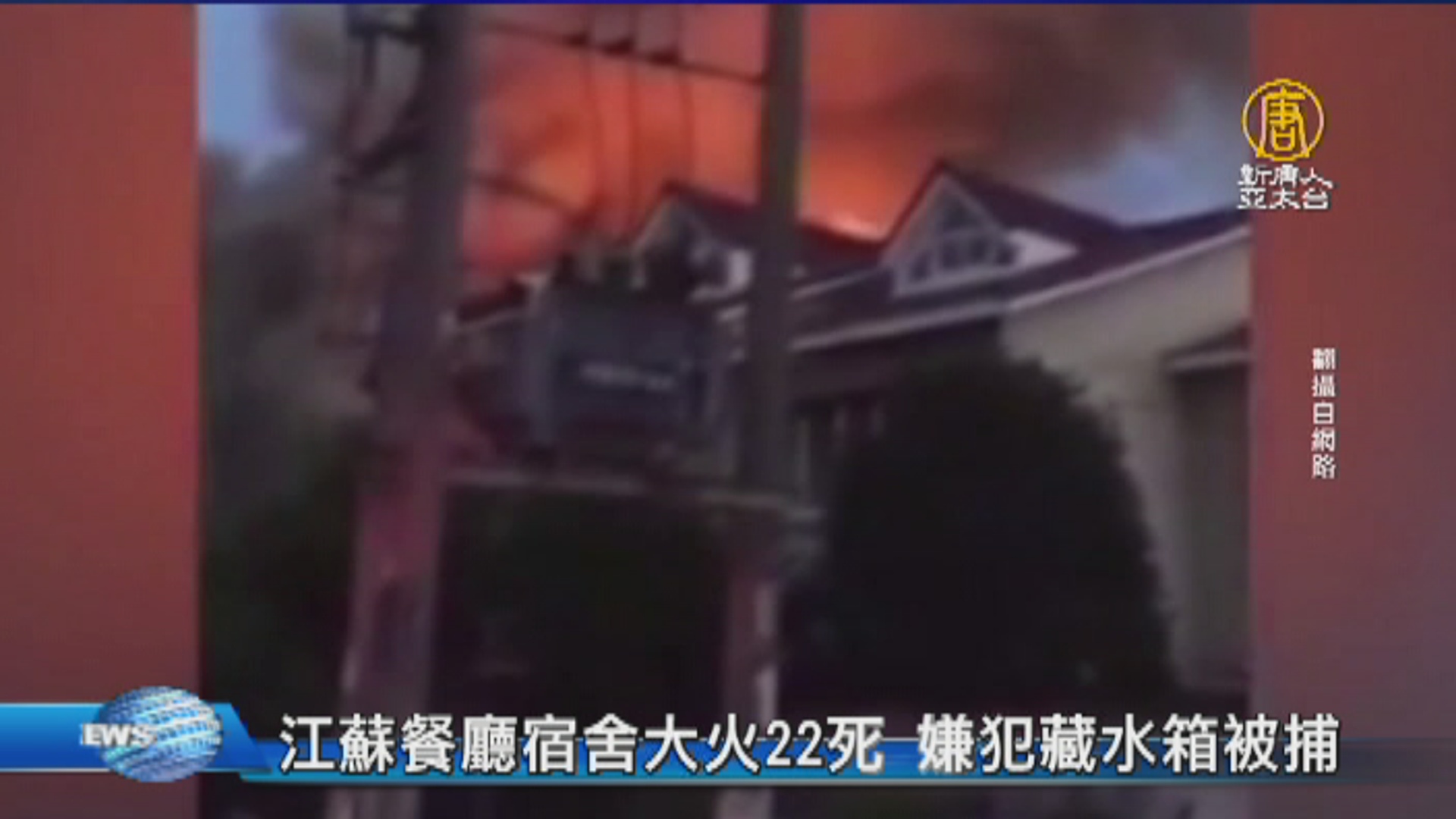 【新唐人亞太台 2017 年 07 月 17 日訊】繼續是一連串的中國新聞,先來帶您關注,中國江蘇昨天凌晨,發生嚴重的餐廳員工宿舍大火,造成22人死亡、3人受傷。從畫面上看到,火災事發現場,慘不忍睹。具官方通報,縱火嫌犯,藏匿在附近樓頂的水箱,已經被警方擒獲。根據瞭解,嫌疑犯是餐廳老闆的親戚,傳言向老闆借錢未成,因此放火報復。