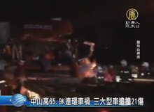 2016-06-23 07:04:46今天凌晨12點多,國道中山高速公路南下65.9公里,靠近幼獅交流道口,發生連環車禍。三輛大型車追撞,現場總共有21名傷者,都已送往醫院救治,車禍現場也已經排除。車禍發生當時,只有1名貨車駕駛受困車上,警消破壞車體將人救出,救出時貨車司機還有意識,目前已送往醫院檢查。詳細車禍原因,還有待警方調查。