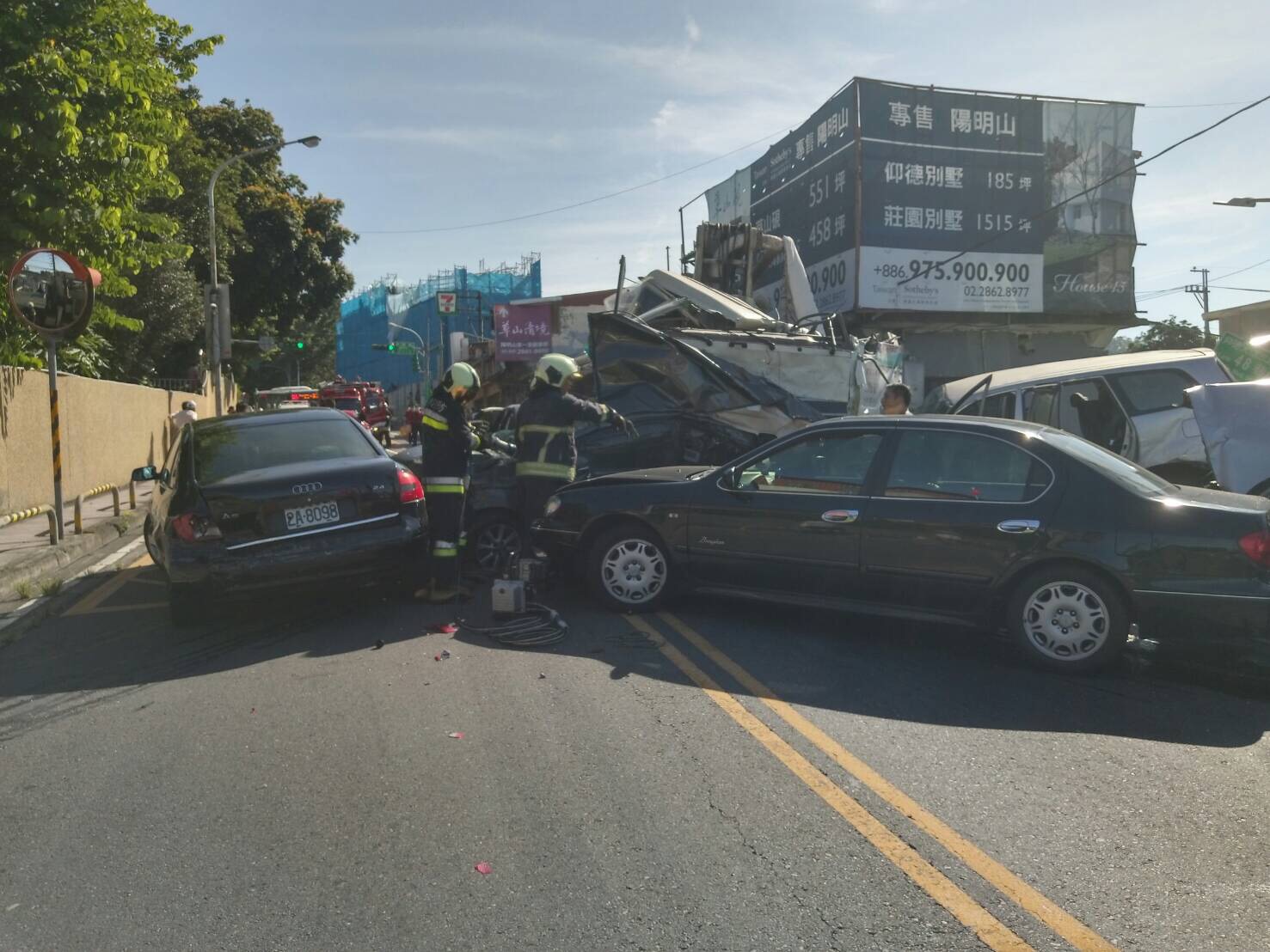 台北市仰德大道3段49號前今天上午8時多發生7車連環車禍,交通警察大隊指出,1輛預拌混泥土車下山時疑似失控撞向上山方向的小客車引發連環車禍,8部自小客車,7部機車及1部混凝土車連環車禍,扭曲變形的7車橫斷仰德大道路面。還波及房屋50、52、54、56號,輕重傷合計13名(4名OHCA:3男1女;9名傷者:7男2女)。
