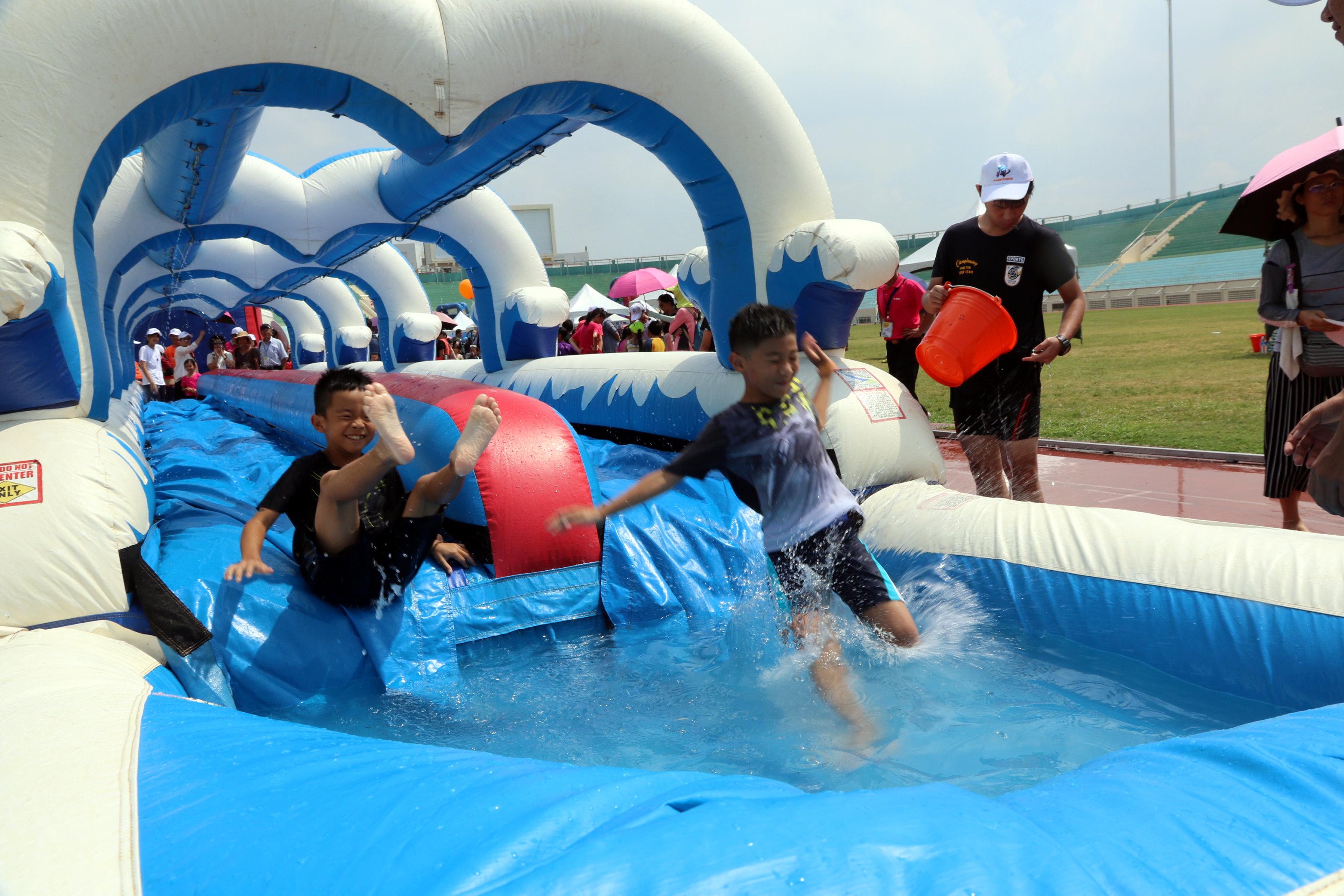 4層樓高的巨無霸滑水道,造價超過2百萬台幣,在中正運動場令小朋友尖叫連連,小朋友興奮的爬上四層樓高的氣墊梯,再一鼓作氣的往下滑,飛快的速度,夾雜著歡呼聲,刺激又有趣,讓現場洋溢著熱鬧與歡樂;尤其現場人潮更是擠爆現場,每項遊戲氣墊前,到處是小朋友排隊等待遊戲,以及在氣墊上快樂的遊戲畫面。