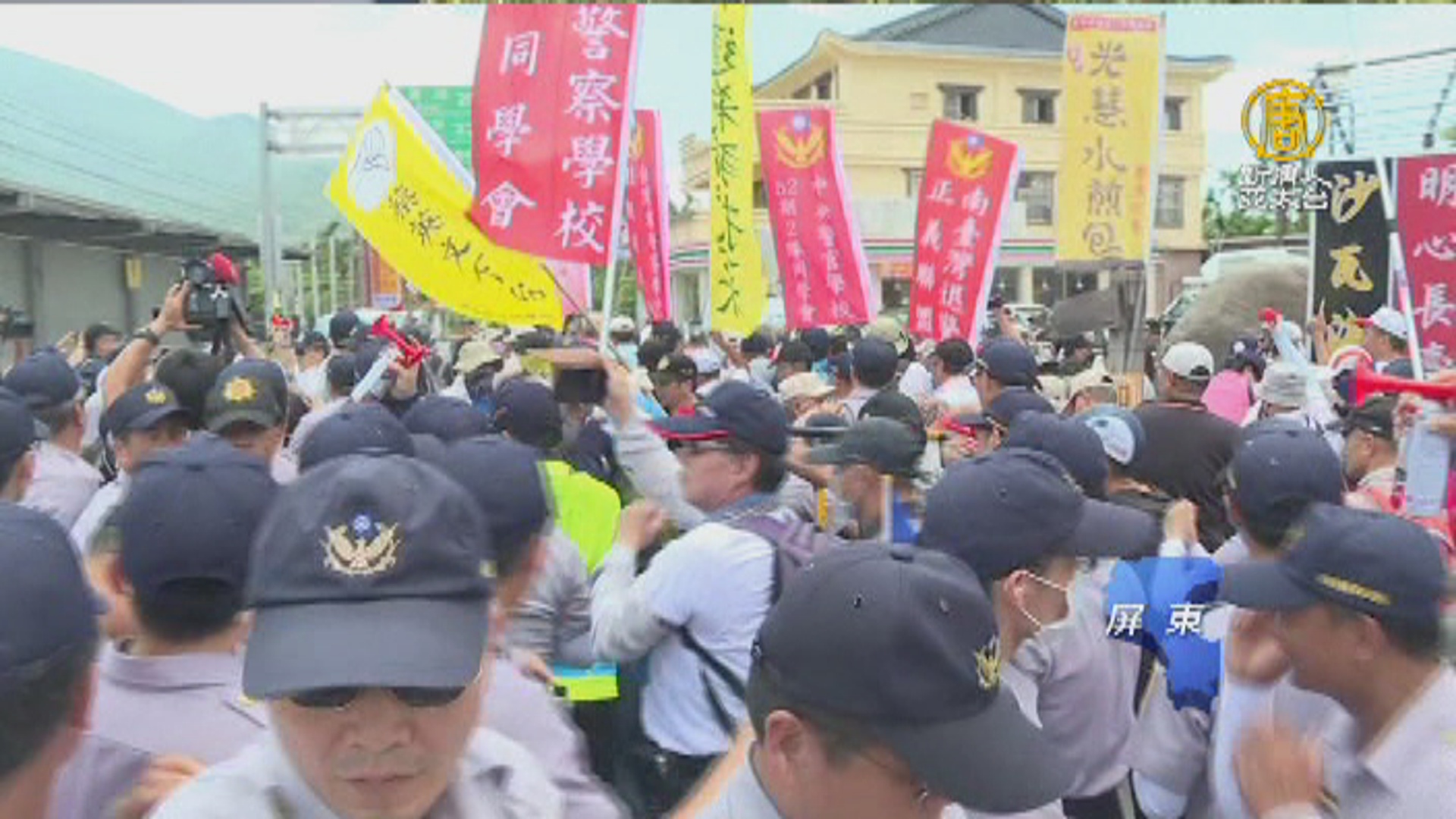 【新唐人亞太台 2017 年 07 月 20 日訊】好,總統蔡英文到屏東涼山基地視導,但反年改團體,又聞風而至,就算警方在重要路口設置拒馬,還派出直升機空中巡邏。反年改依舊和警方爆發推擠,試圖衝破防線想挺進涼山。