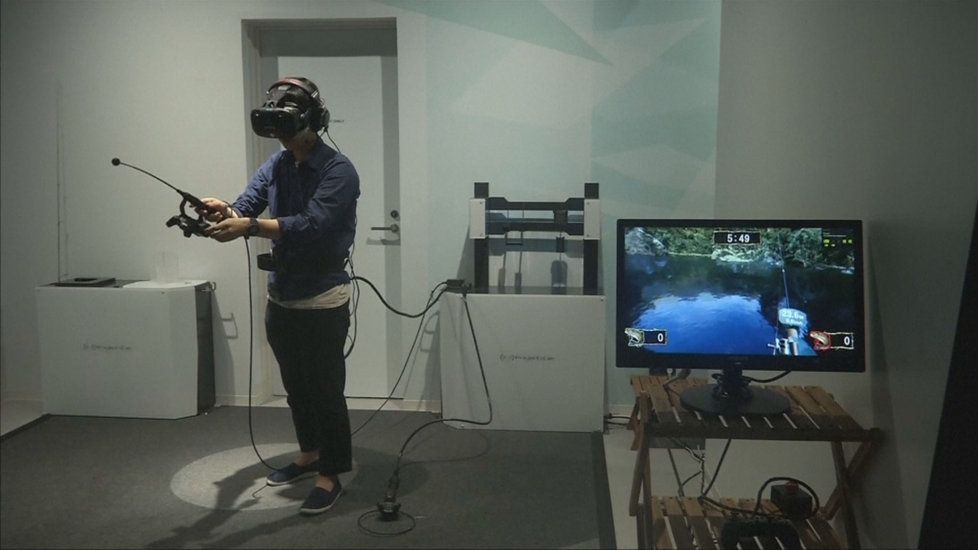 廣場另一邊,有個人靜靜的站著,他在做甚麼?準備好,甩杆,原來是釣魚遊戲。這裡不只讓玩家樂在其中,路過遊客也都能透過螢幕上的玩家視角一同參與其中。