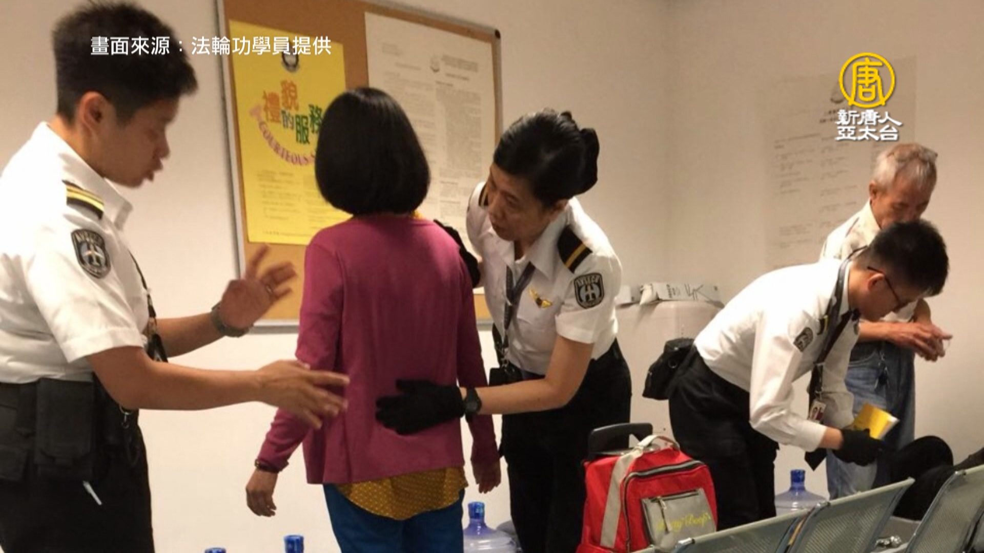 台灣法輪功學員 徐女士:「到入境的時候,他們(香港海關)就寫很久,然後就說帶我們到入境室裡面去了。我們有問,因為我們一直問說是什麼原因,他們只是說要檢查,然後就叫我們要坐在那裡。就一直迂迴,他也沒有說原因。」