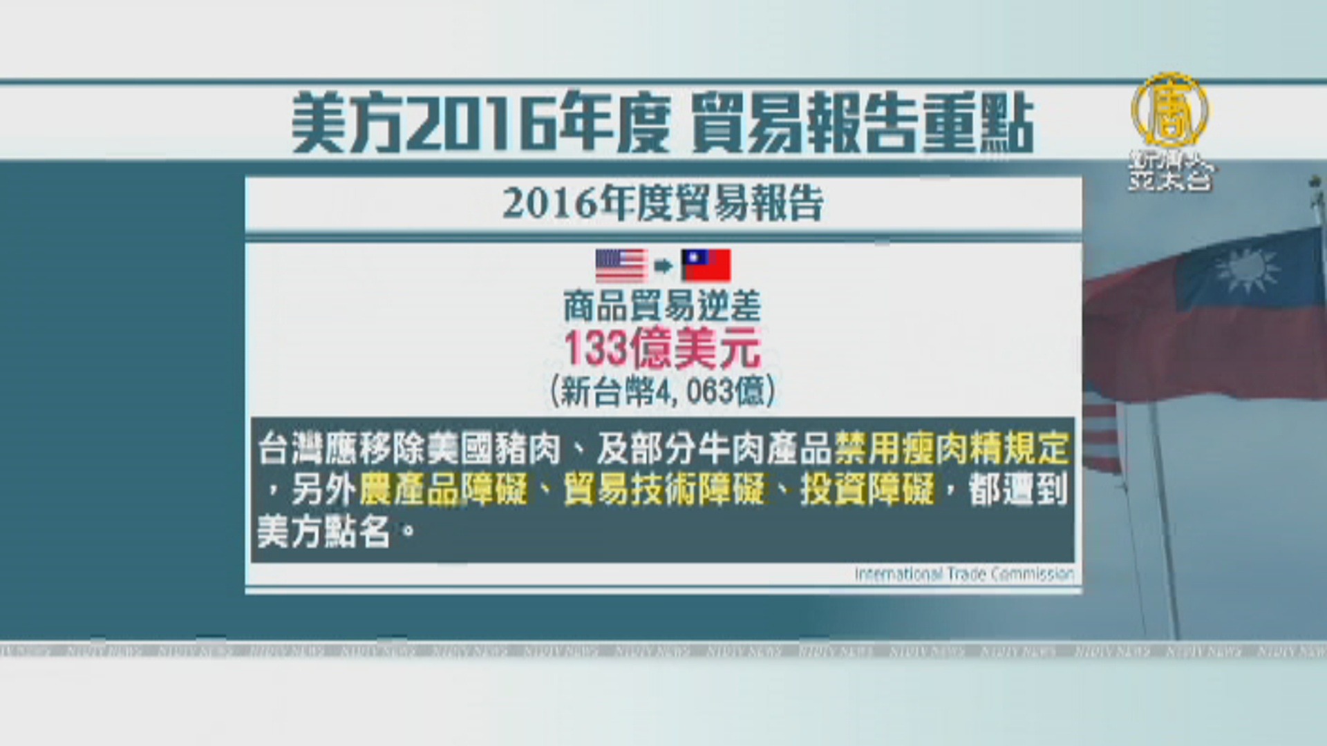 美國國際貿易委員會,周二也公布2016年度貿易報告,去年美國對台灣商品貿易逆差,達133億美元,相當於新台幣4063億,報告中提及:台灣應移除美國豬肉、及部分牛肉產品禁用瘦肉精規定,另外農產品障礙、貿易技術障礙、投資障礙,都遭到美方點名。