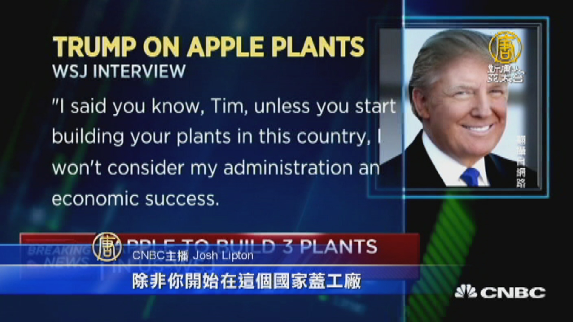 CNBC主播 Josh Lipton:「川普總統告訴華爾街日報,蘋果執行長庫克,已經承諾,將在美國蓋三座大型的製造工廠。」