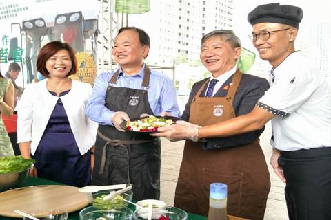 全聯林敏雄董事長與台中市張副市長親手製做白玉豆干沙拉料理。(全聯提供)