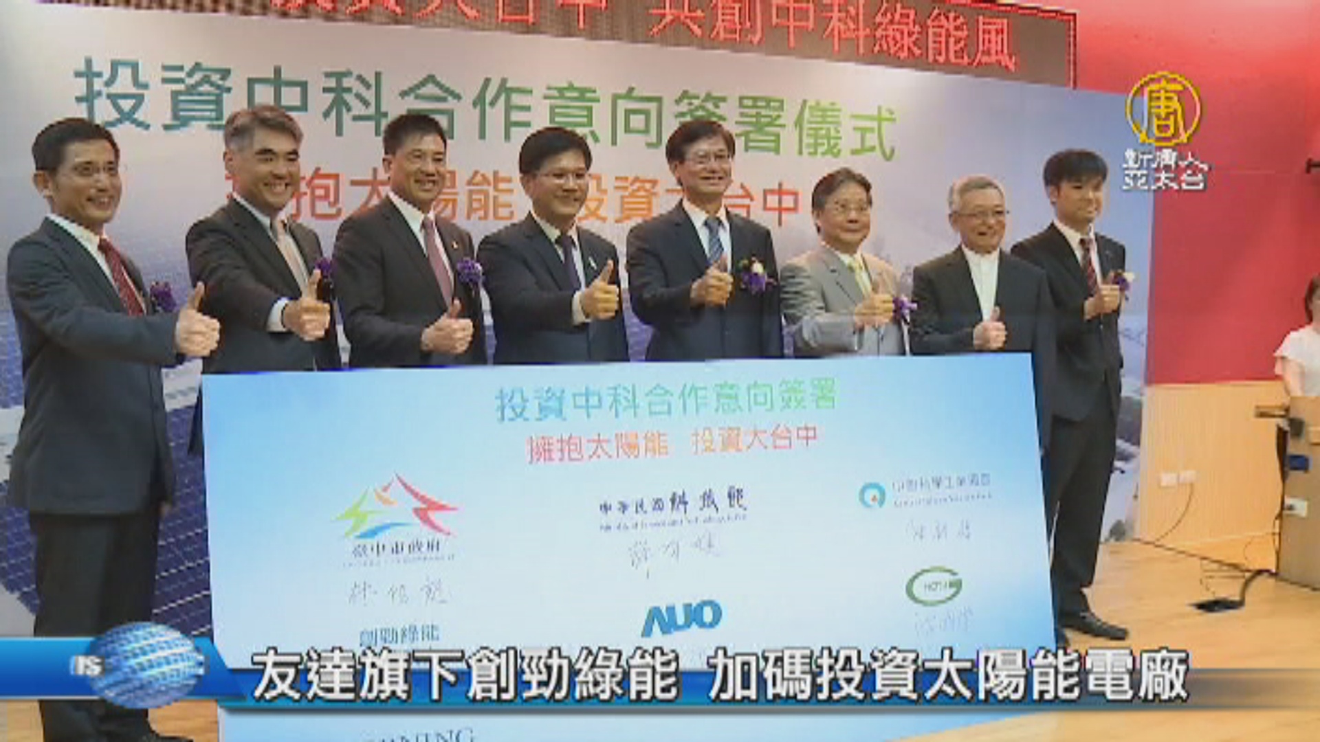 【新唐人亞太台 2017 年 07 月 28 日訊】響應蔡政府非核家園,國內面板大廠友達,旗下的創勁綠能公司宣布,加碼投資太陽能電廠。今天與中科管理局簽署備忘錄,台中市長林佳龍期許,將設置更多的太陽能廠在中科廠商的屋頂。