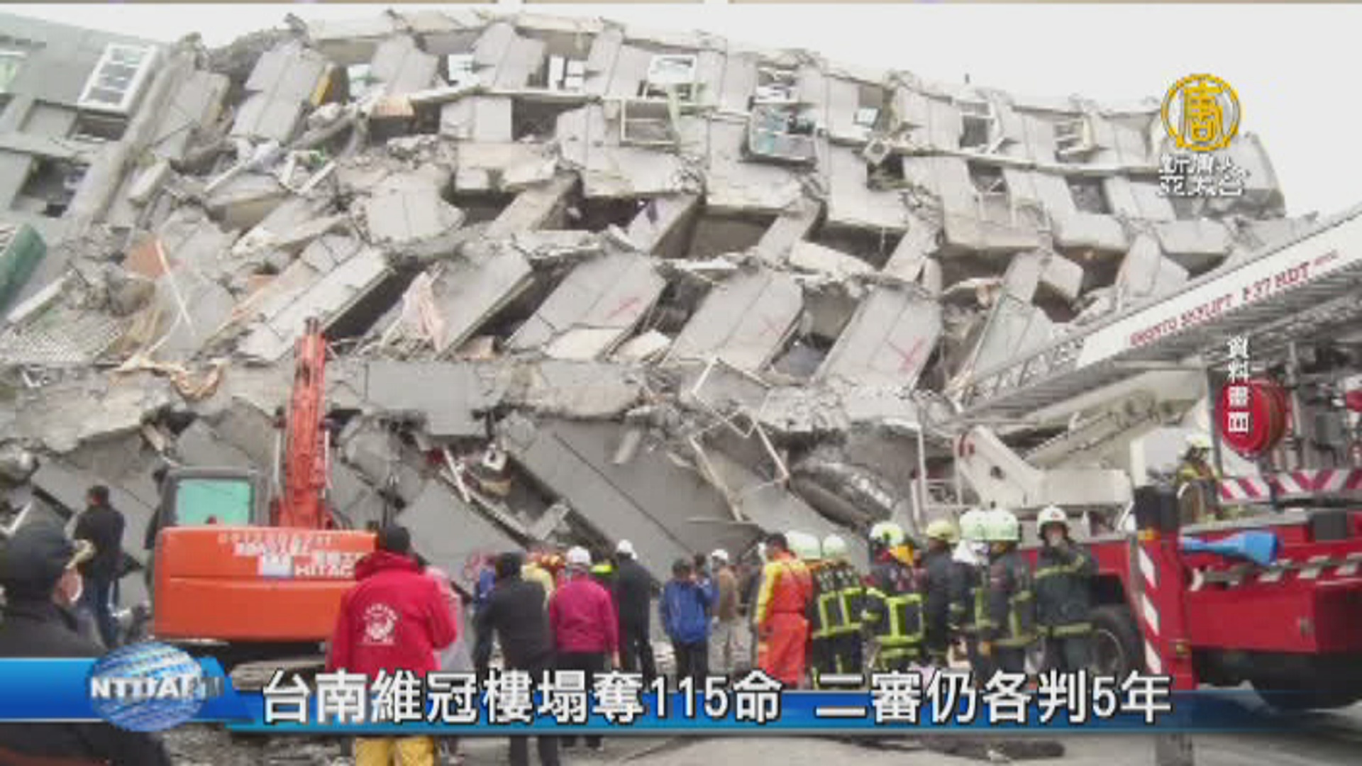 【新唐人亞太台 2017 年 07 月 28 日訊】去年2月台南大地震造成永康維冠金龍大樓倒塌,115人死亡,建商林明輝等5人因涉嫌偷工減料,被控業務過失致死罪,一審判最重刑期5年,併科罰金9萬元,台南高分院今下午二審宣判,刑度仍維持5年,全案還可以上訴三審。
